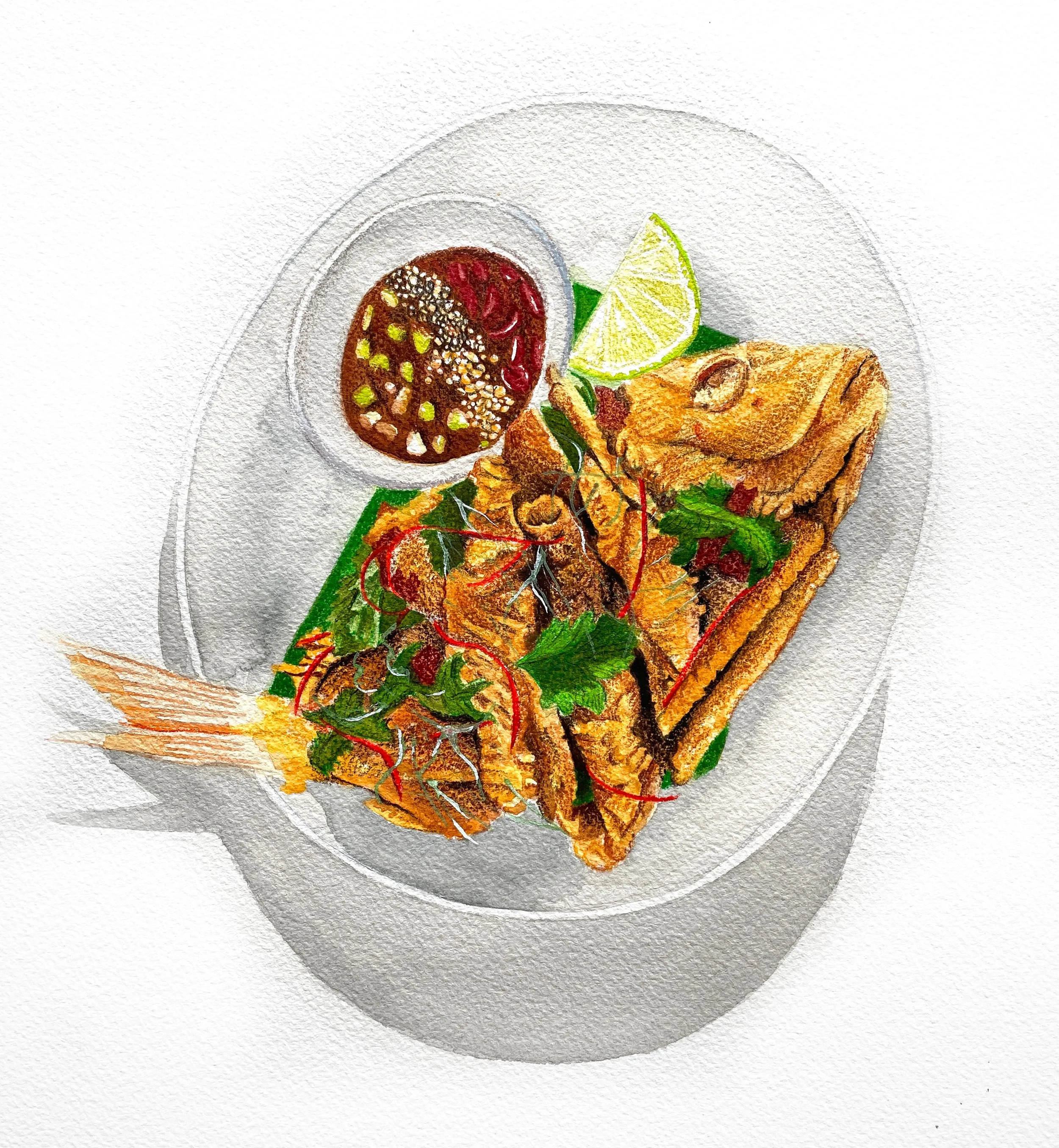 Fried fish from Longrain, Watercolour, Gouche, Pencil, 210 x 297mm